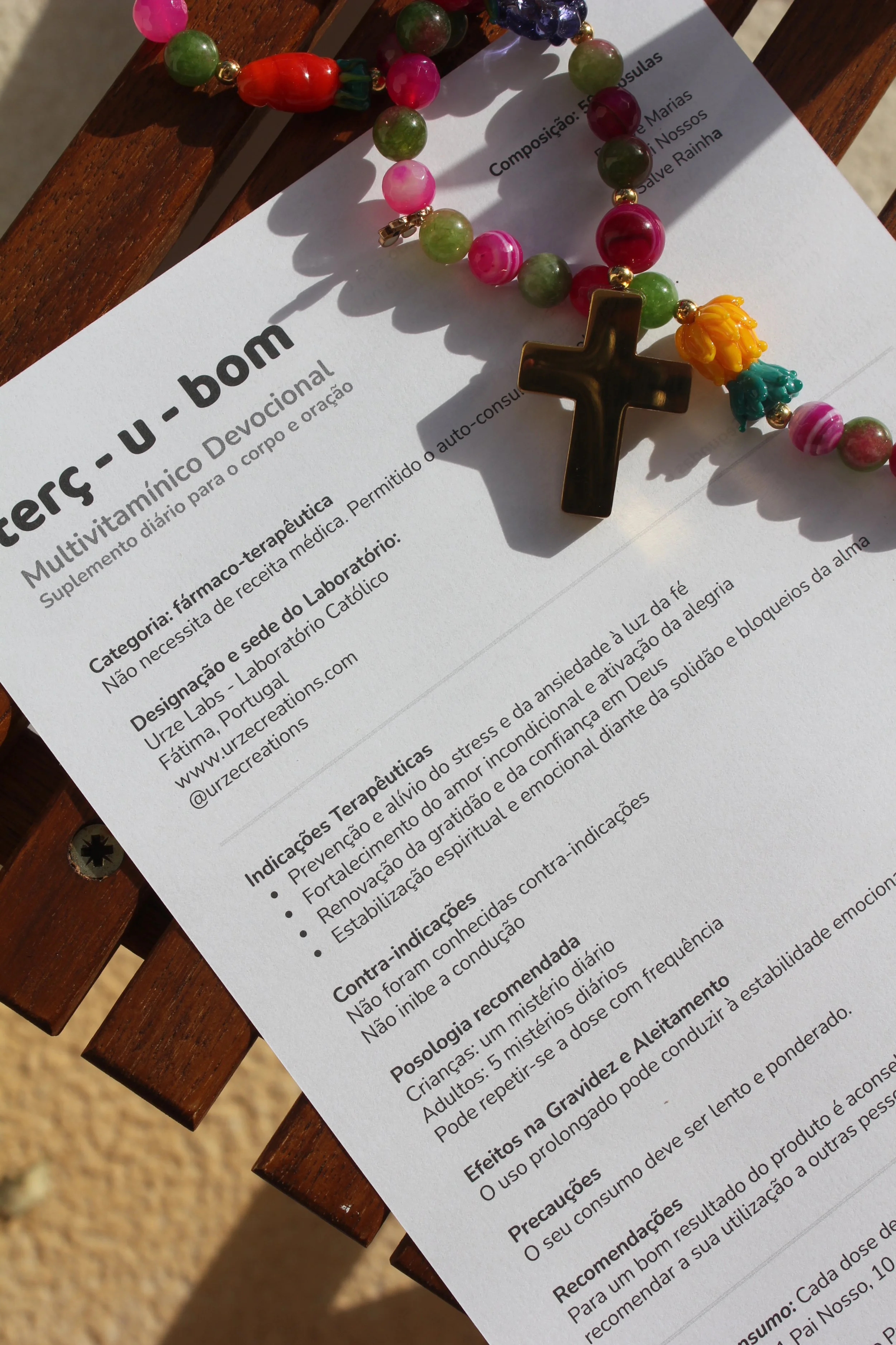 No terç-u-bom, oferecemos várias combinações de cores, mas os frutos e as medalinhas podem variar ligeiramente, tornando cada terço verdadeiramente especial.