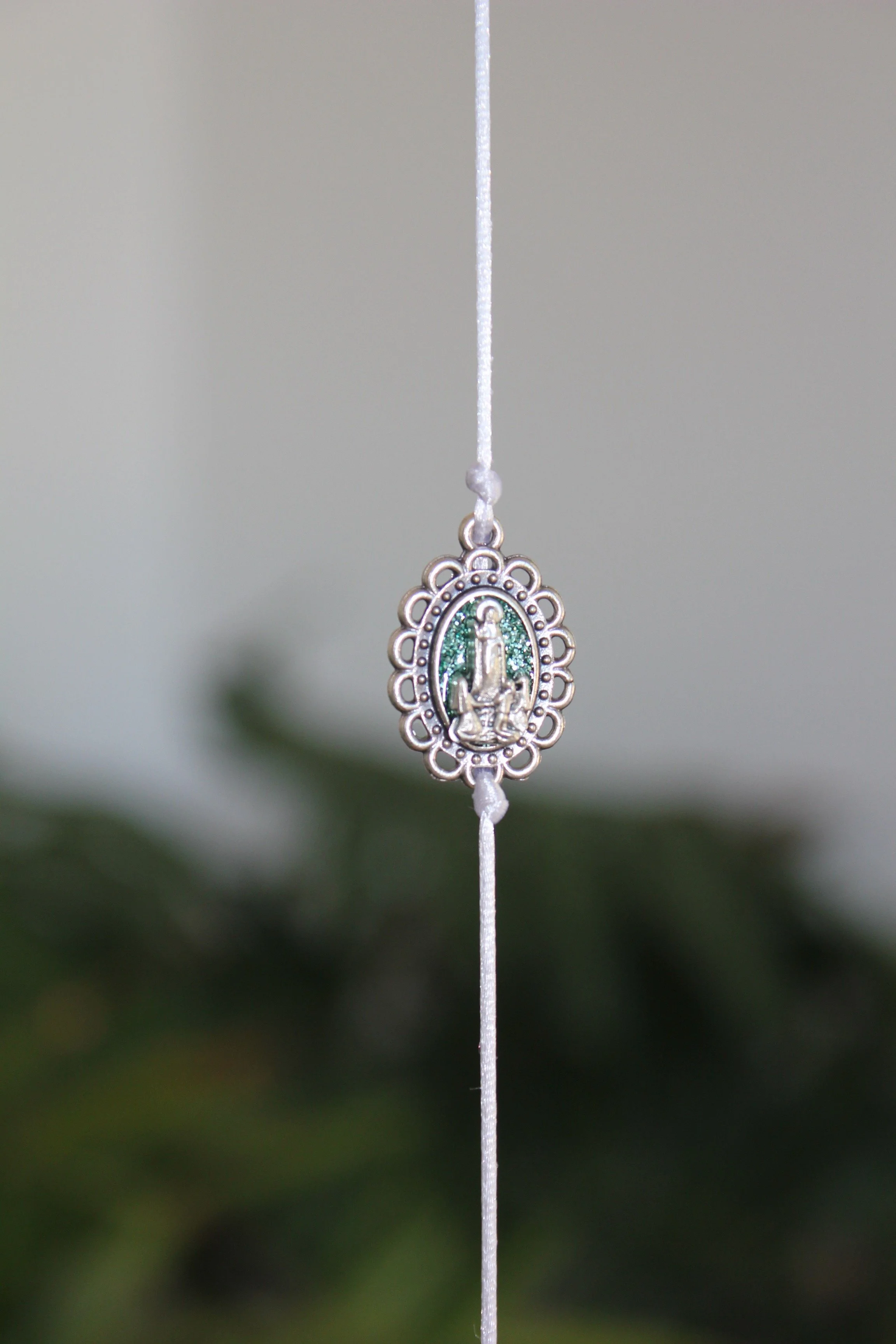 Nos sininhos, cada bolota é diferente (um pequeno tesouro da natureza) e tanto as pedras como a medalhinha de Nossa Senhora de Fátima que adornam a corda podem apresentar variações de tom e detalhe, reforçando o encanto artesanal de cada peça.