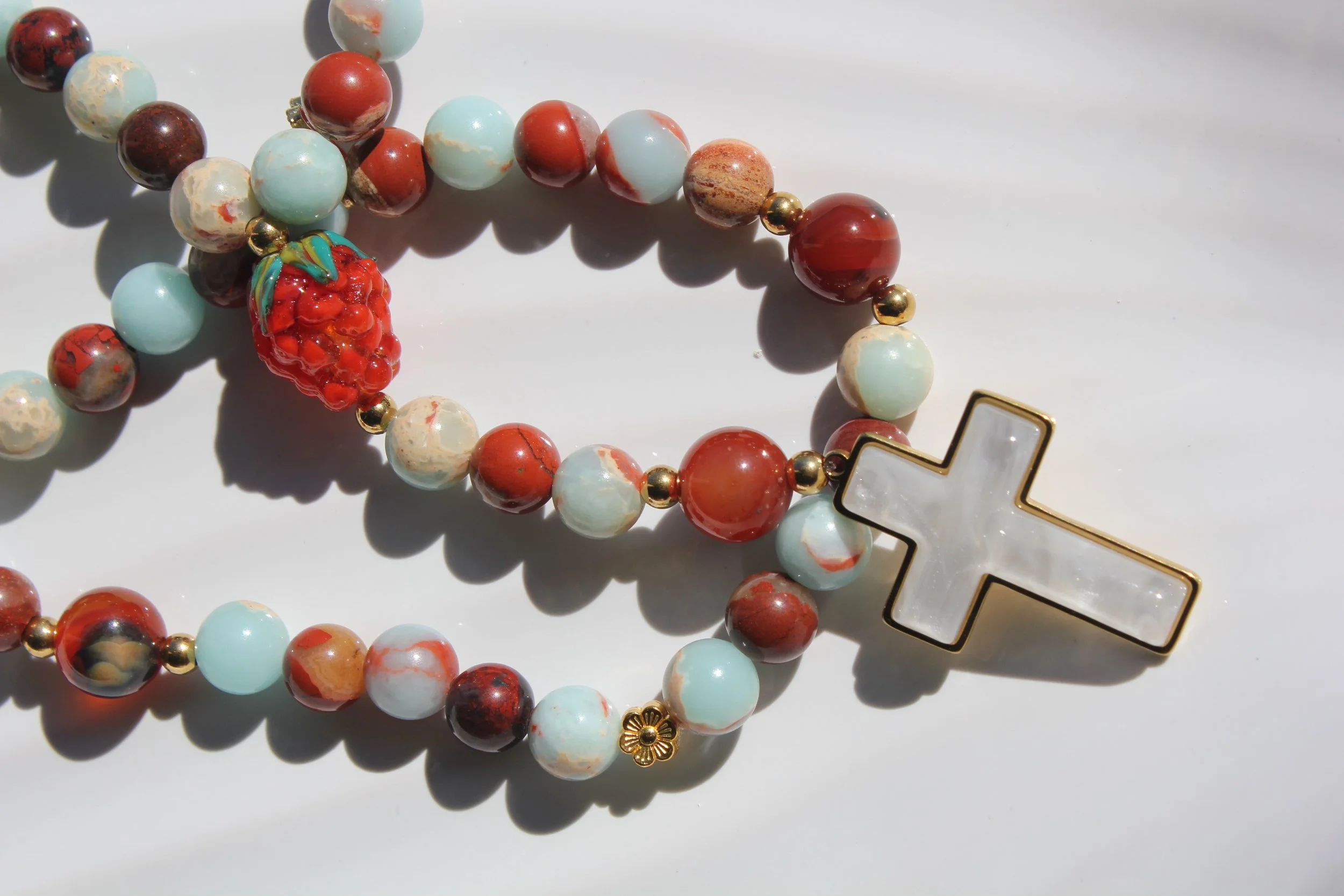 O peso das contas - frias, sólidas - ancora-nos à terra, a algo que não se perde nem murcha. Entre elas, frutos em vidro Murano captam a luz, devolvendo-nos a sua doçura e os seus benefícios, para o corpo e para a alma. Esta é a dose diária que não se mede em gramas nem calorias. Tomada de manhã, de preferência com a primeira luz, nutre-nos com fé e alegria, lembrando-nos que rezar pode ser um ato leve, com benefícios nutritivos para todos, dos mais pequenos aos mais sábios.
